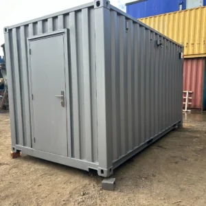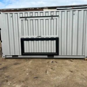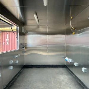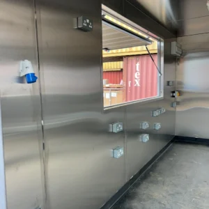 Description: 20ft New Shipping Container, Wind + Water Tight, Piston Hatch, x1 Security Personnel Door, Insulation, Electrics, Stainless Steel, Non Slip Floor